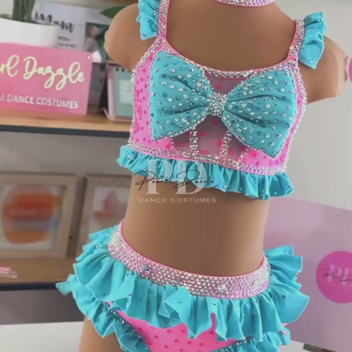 Featuring a vibrant pink and turquoise color palette, this set includes a structured crop top with a statement oversized bow centerpiece, fully embellished with premium rhinestones for maximum stage sparkle. The top is accented with delicate mesh detailing and crystal trim for a polished, high-end finish.