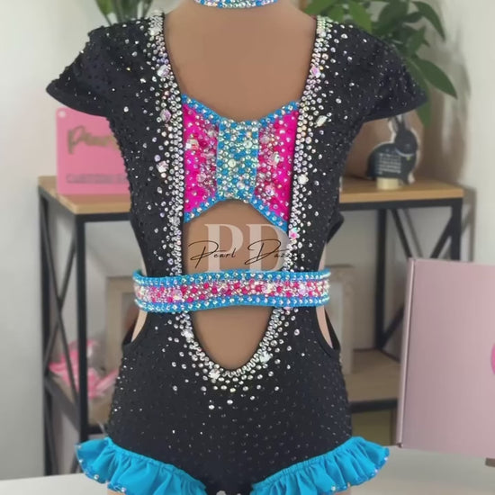 Crafted on a sleek black base, this leotard features a vibrant hot pink and turquoise crystal panel that catches the light from every angle. Hand-placed rhinestones cascade down the bodice for maximum sparkle, while the front cutout and crystal waistband add a modern, confident edge. The soft turquoise ruffle trim gives it the perfect finishing touch of movement and flair.