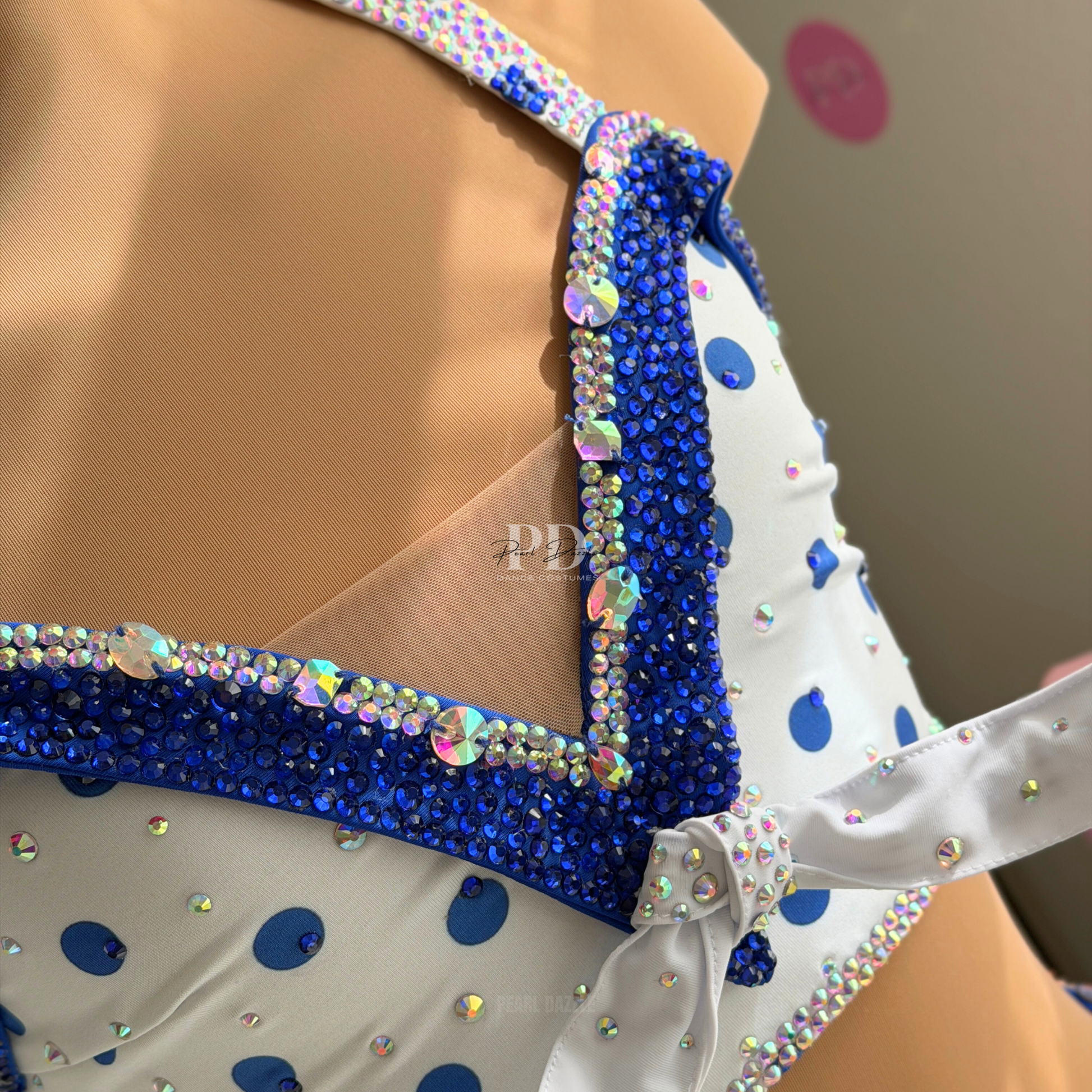 This sweet and stage-ready blue polka dot jazz costume is available now and designed to shine under the lights. Featuring crystal-trimmed details, playful polka dots, and a flowy skirt that moves beautifully, this look delivers a polished, cheerful vibe with full freedom of movement—perfect for classic, upbeat jazz performances.